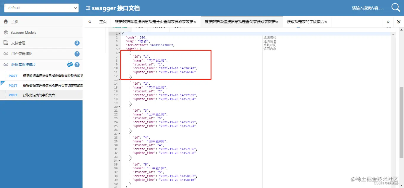 如下是具体获取到的数据,将获取到的表字段名作为key,value为具体的数据库存放数据。