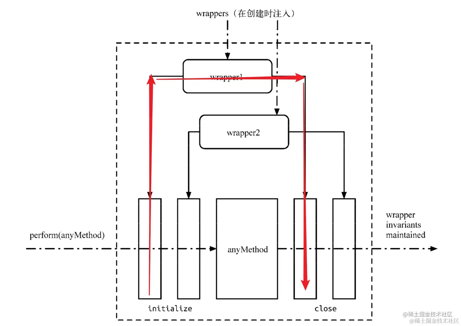 简单地说,一个 Transaction 就是将需要执行的 anyMethod 使用 wrapper 封装起来,在通过 Transaction 提供的 perform 方法执行,而在 perform 之前,先执行所有 wrapper 中的 initialize 方法,perform 之后再执行所有 wrapper 中的 close 方法。一组 initialize 及 close 方法称为一个 wrapper,Transaction 支持多个 wrapper 叠加。