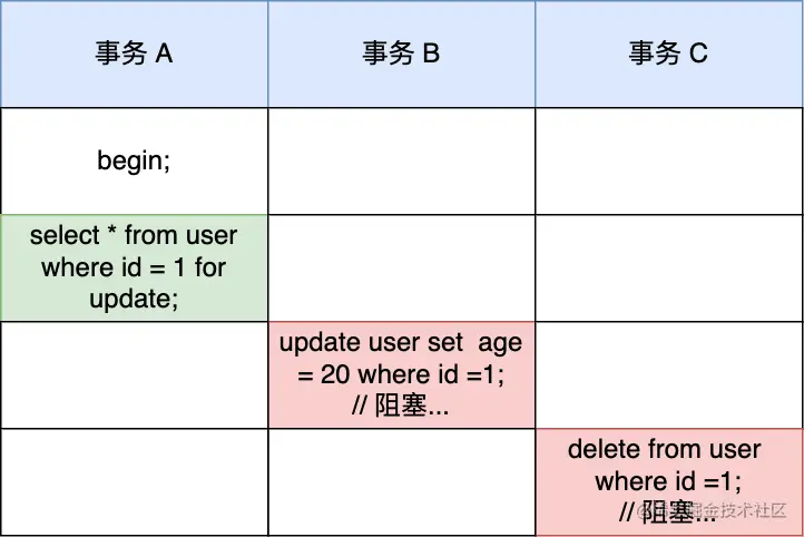 因为事务 A 对 id = 1的记录加了 X 型的记录锁,所以事务 B 在修改 id=1 的记录时会被阻塞,事务 C 在删除 id=1 的记录时也会被阻塞。