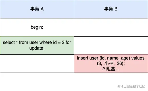 mysql> select * from user where age >= 22 for update;