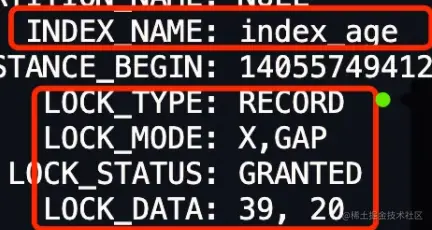 LOCK_DATA : 39, 20可以得知,其他事务插入 age 值为 39 的新记录时,如果插入的新记录的 id 值小于 20,那么插入语句会发生阻塞,如果插入的新记录的 id 大于 20,则可以插入成功。
