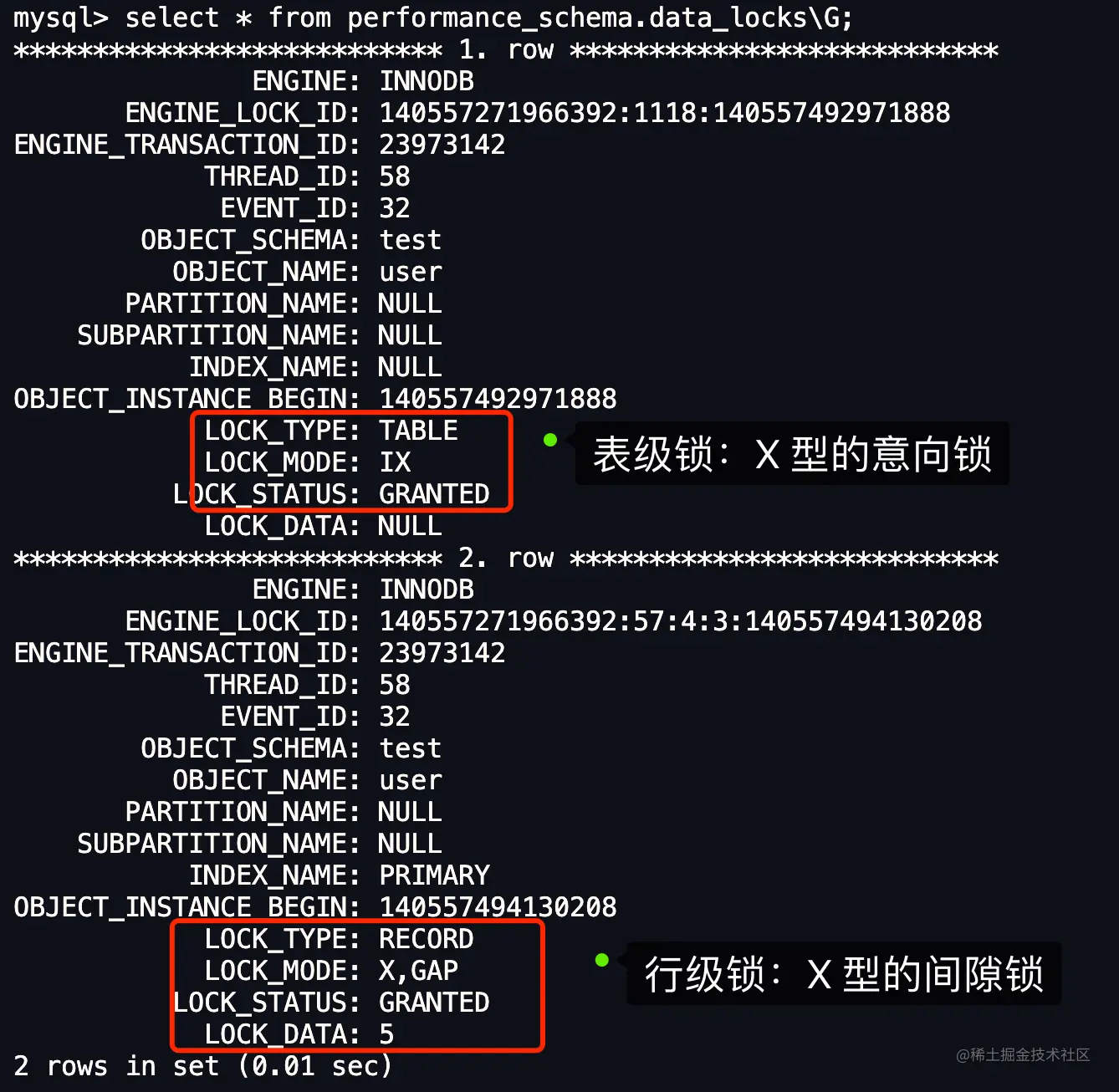 这里我们重点关注行级锁,图中 LOCK_TYPE 中的 RECORD 表示行级锁,而不是记录锁的意思。