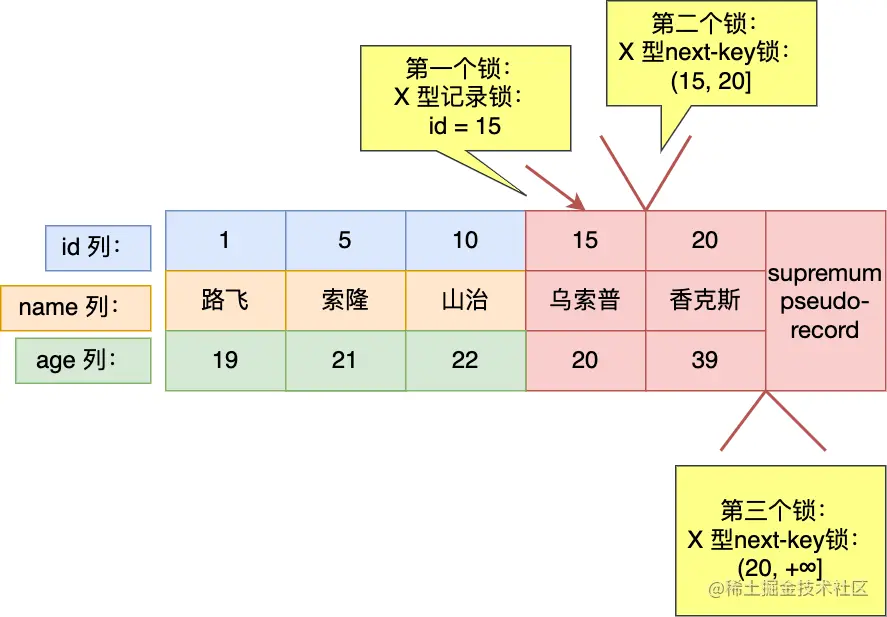 从上图的分析,可以看到,事务 A 对二级索引(INDEX_NAME: index_age )加了两个 X 型锁,分别是: