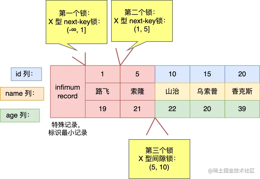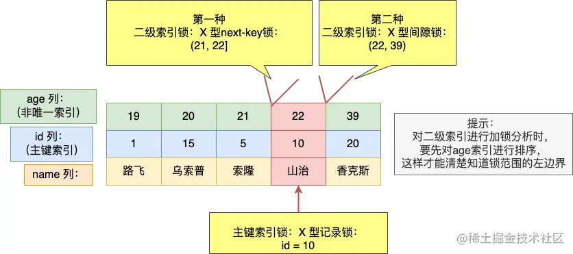 二级索引树是按照二级索引值(age列)按顺序存放的,在相同的二级索引值情况下, 再按主键 id 的顺序存放。知道了这个前提,我们才能知道执行插入语句的时候,插入的位置的下一条记录是谁。