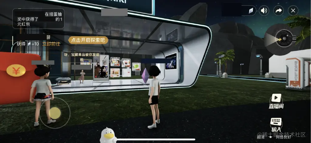 从主播的角度,我们希望给主播提供一个更亲近用户的运营空间。主播日常中和用户最多的交互就是通过屏幕进行商品的讲解,但是这很难让用户对主播“人格”有更深的了解。我们在“直播未来城”中给每个主播都搭建了一个帐篷,帐篷形状根据主播要求定制。帐篷中除了看直播,还有主播个人NPC形象与用户进行交流互动。我们希望这种方式能够给用户“虚拟空间中和主播在一起“的体感,拉近主播和用户的距离。当然未来我们会扩展帐篷,来展示更多主播个性化人格化的内容。