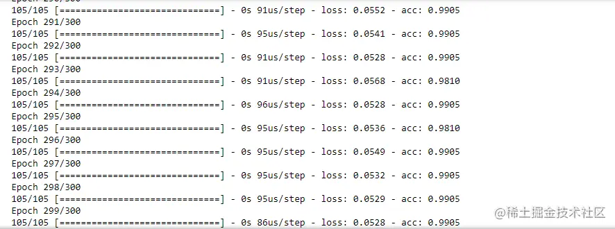 model.fit(X_train, y_train, epochs=300, batch_size=10)