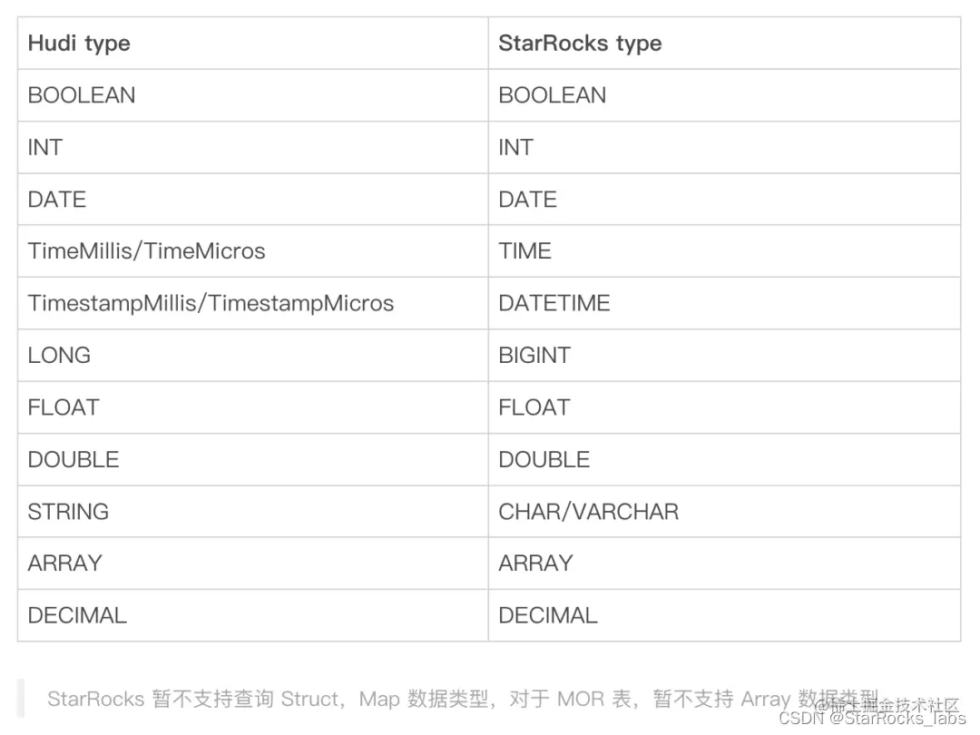 备注:即将发布的 StarRocks 2.5.0 版本会支持 Struct、Map 数据类型的读取,Hudi COW 表也会同步支持。