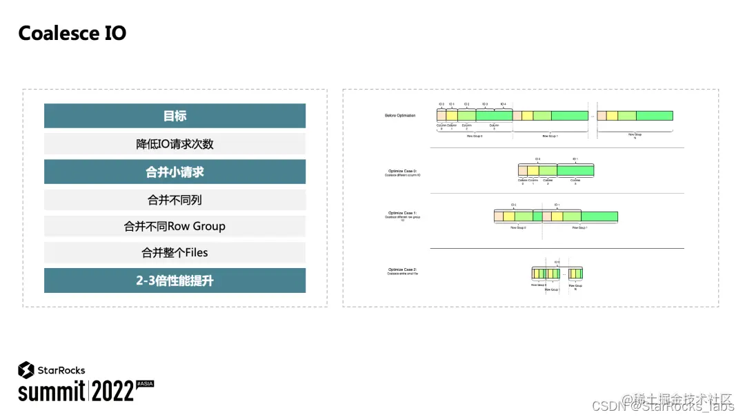 - Coalesce IO:读取数据文件时,合并小的 IO 请求(如小的列,小的 Row Group),减少 IO 次数,增加每次 IO 的请求量,提升查询性能。