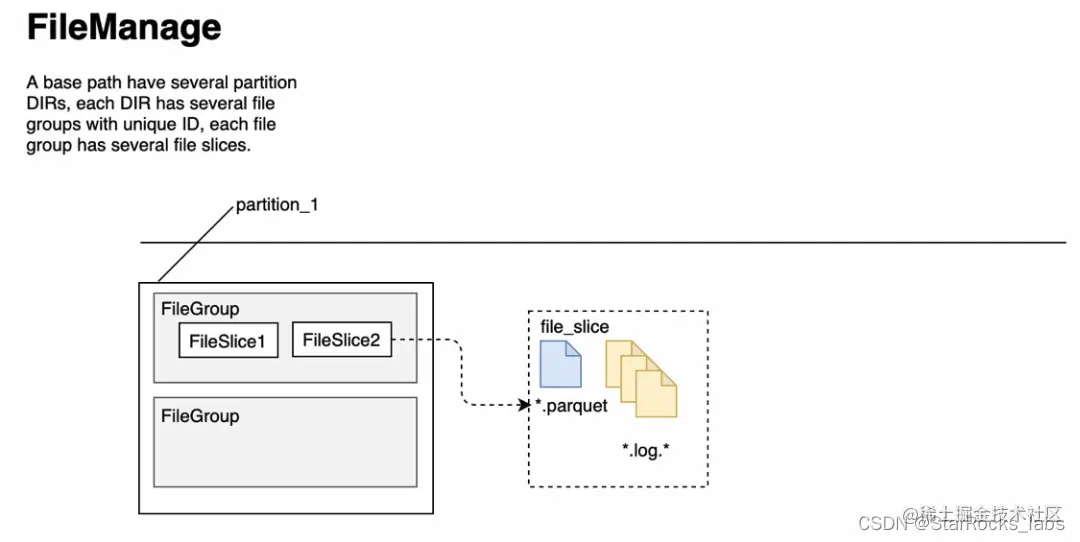 Hudi 将单个目录下的数据划分为多个 File group,每个 File group下包含多个 File Slice,File Slice 是 Hudi 文件组织系统里的最小管理单位,它由 0 个或 1 个 base 数据文件(列存储)和 0 个或多个增量 delta log 文件(行存储)组成。