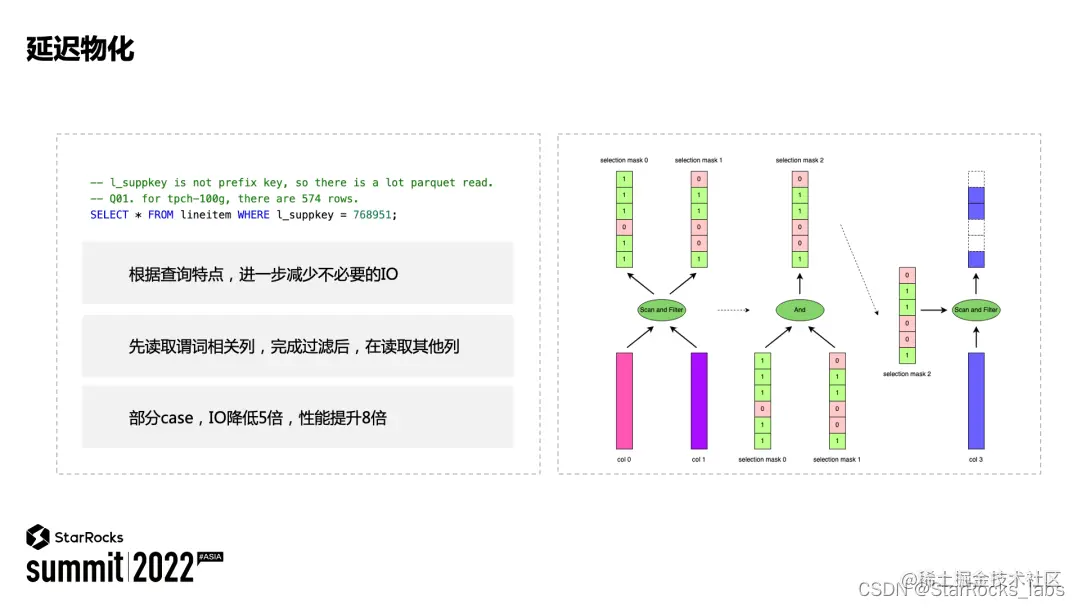 - 延迟物化:根据查询请求特征进行优化,先将参与谓词计算的列读出来,然后根据计算谓词的过滤结果,再将过滤结果下推读取其他列,并跳过被过滤的行,从而达到减少 IO 请求次数,提升查询性能。