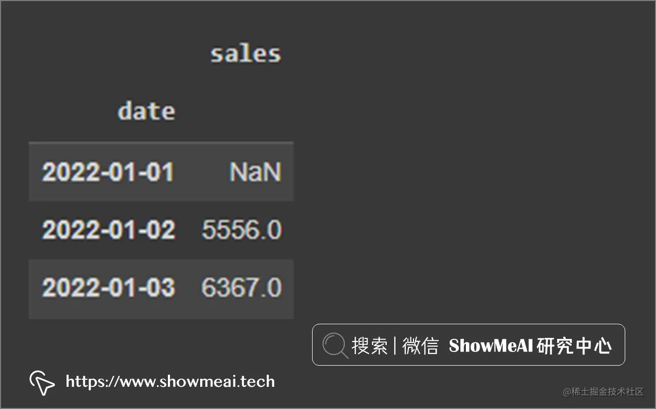 在下图中,我们可以看到第一个值是NaN,因为再往前没有数据了。对第2个点,它对数据集的前2行计算平均: (6787 + 4325)/2 = 5556。