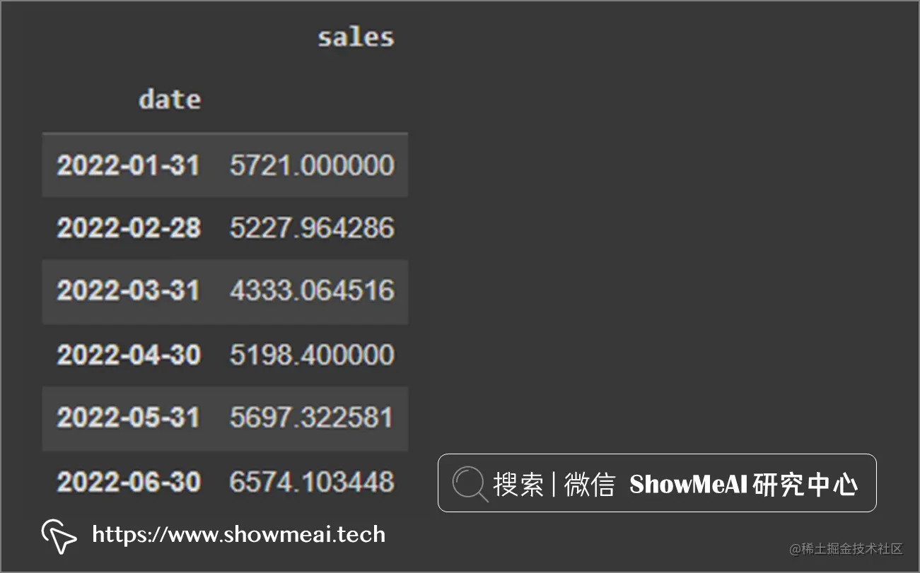 按月取平均值后,将索引设置为每月结束日期,结果如下。