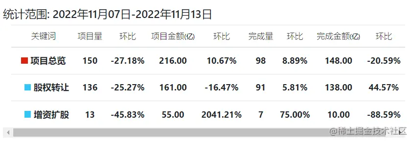 主要对项目总览、股权转让、增资扩股进行汇总,从项目量、项目金额、完成量、完成金额等维度出发,并做了环比计算。详情如下图: