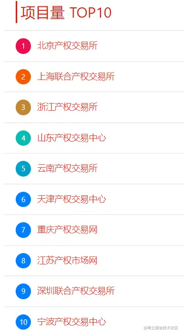 本周交易机构新增披露项目量排名TOP10有:北京产权交易所、上海联合产权交易所、浙江产权交易所、山东产权交易中心、云南产权交易所、天津产权交易中心、重庆产权交易网、江苏产权市场网、深圳联合产权交易所、宁波产权交易中心