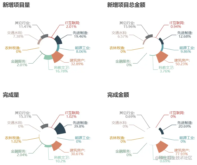 塔米周报按照行业对新增项目量、新增项目总金额、完成项目量、完成项目金额进行了统计并可视化展示。