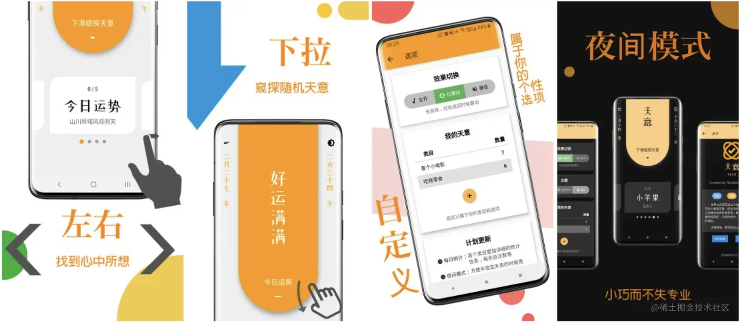 - 天意 - 让选择变成享受 - 这是一个随机选择器,自带“今日运势”、“这会吃啥”、“休息片刻”和“是与不是”四大常用主题,挺有趣的产品。只有 Android 端。