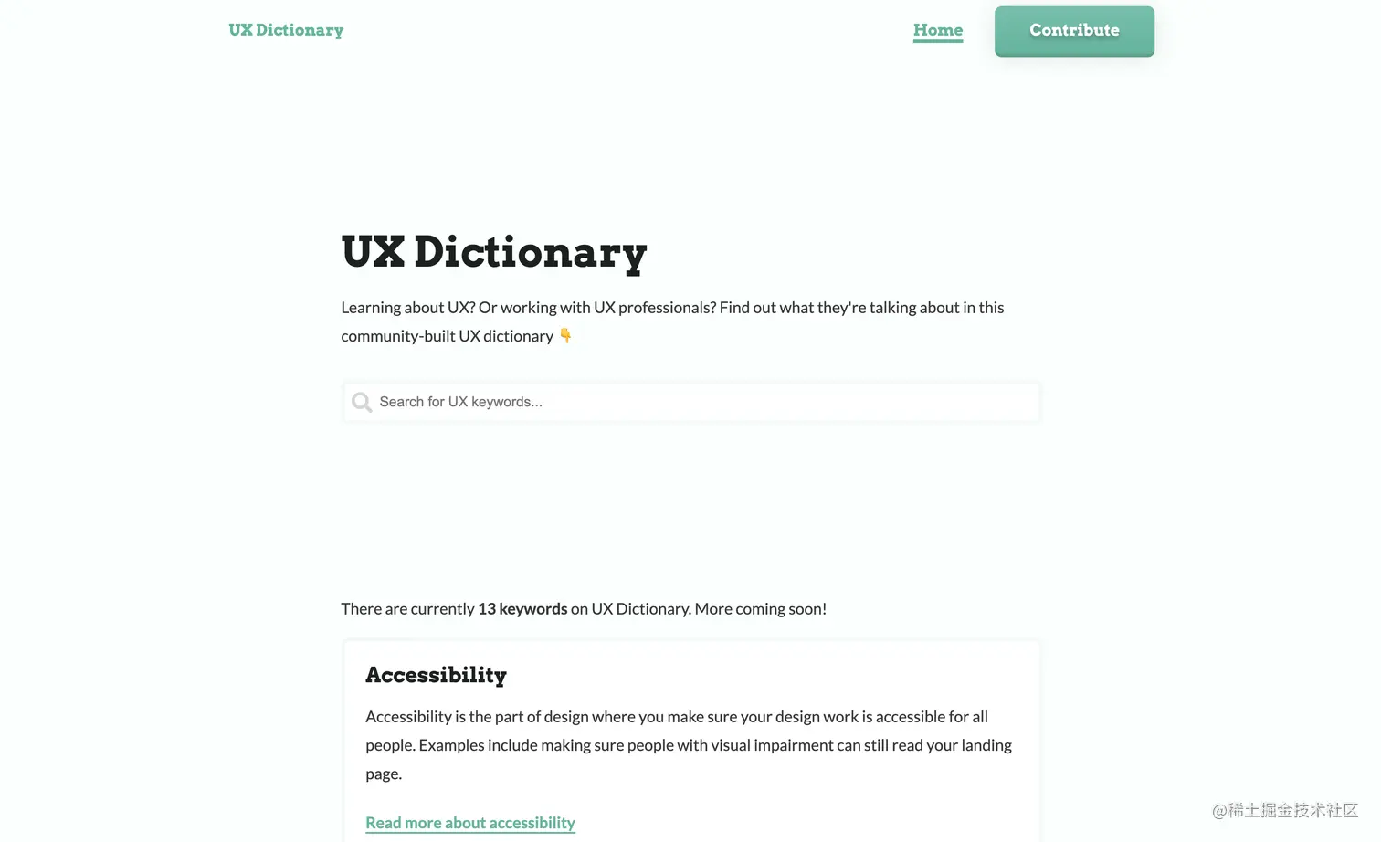 - UX Dictionary - 这是一个用户体验相关的词典,解释了一些交互设计等相关的名词。内容不算很多,作者还在整理。这样的内容如果全的话还是挺有价值的。