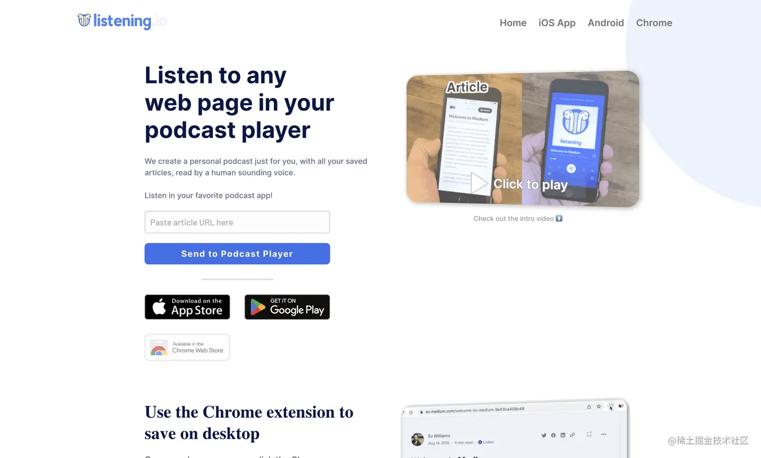 4. listening.io - 这个产品可以将文章转换为音频,然后将其发送到您的播客播放器以便稍后收听。适用于 Spotify、Apple 播客或任何其他播放器,之前有推荐过这类产品,看到外网论坛上很多人有这个需求,讨论也是非常火热。这个产品做的算是很不错的了,没有具体试过,看到做了 iOS,Android,还有浏览器插件,很用心了。