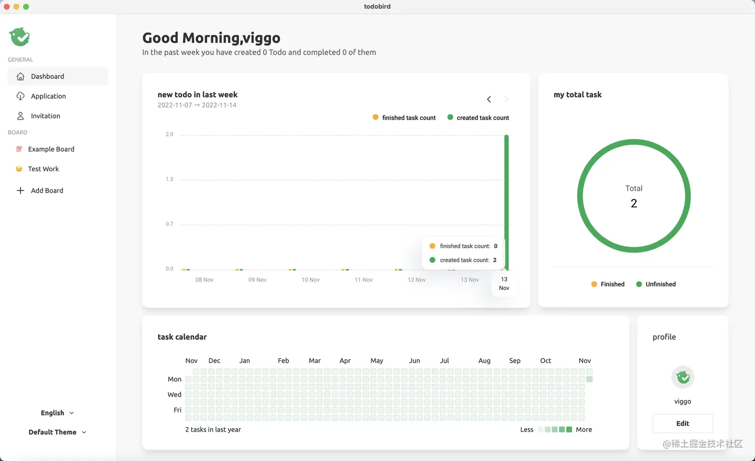 - todobird - 这是一个简单的个人管理TODO工具,没有团队协作功能,作者 @0x_blackrabbit 自己有这个需求才做的这个产品,然后在一周以内就开发了这个产品,很强。产品提供了简单的统计和热力图,提供了个人的 Todo 看版功能,可以更换皮肤,提供了简单封装的Mac和Linux App下载,需要注册使用,邀请码可以在todobird.xyz/v2ex 获得。