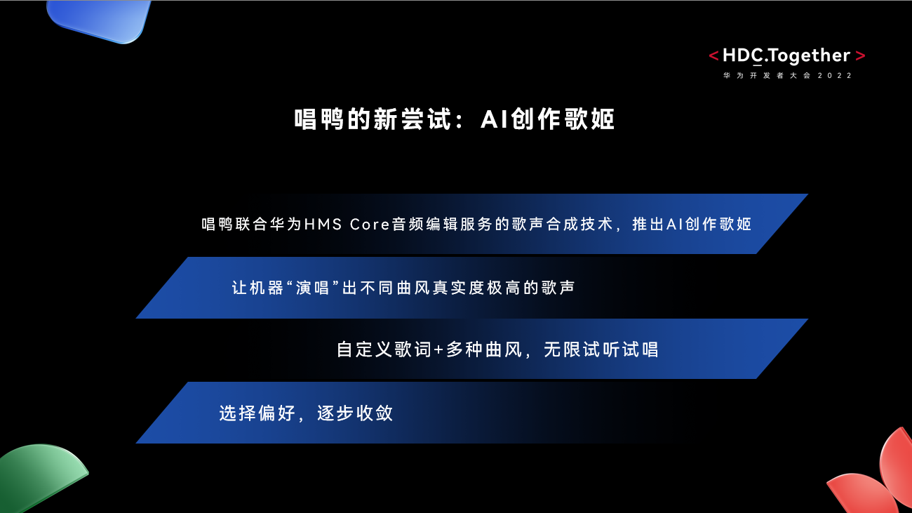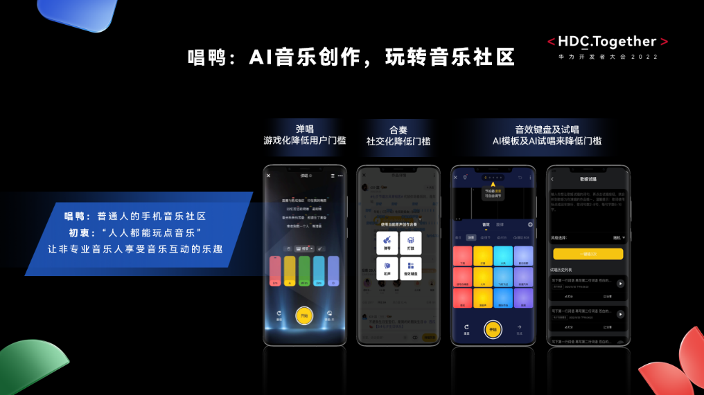 在华为开发者大会2022(Together)智慧AI技术论坛中,唱鸭作为一款作为深受用户喜爱的音乐社区软件,讲述为满足用户不断增强的创意设计,如何与HMS Core音频编辑服务合作,打造更具创意的音乐“玩法”。11月5日唱鸭正式推出,由HMS Core音频编辑服务歌声合成技术打造的“AI创作歌姬”功能。基于华为独创的AI Singer模型,歌声合成可以精准预测颤音、扰动和换气声等演唱技巧,让拟真的呼吸音与歌曲节奏完美契合,实现歌手级的高水准演唱,给用户带来了令人惊喜的新奇体验,释放更具创意的音乐创作力。