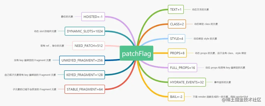 patchVNode,不断堆叠而成的几毫秒,最终就会造成 VNode 更新缓慢。在Vue3.0中,在这个模版编译时,编译器会在动态标签末尾加上/* Text*/ PatchFlag。也就是在生成VNode的时候,同时打上标记,在这个基础上再进行核心的diff算法并且 PatchFlag 会标识动态的属性类型有哪些,比如这里 的TEXT 表示只有节点中的文字是动态的。而patchFlag的类型也很多。