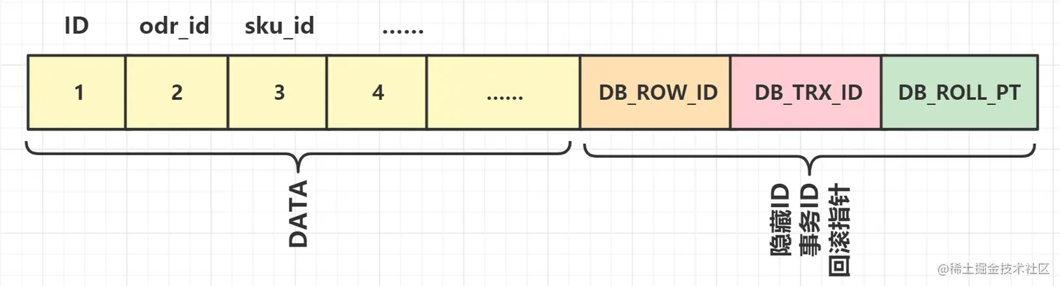 默认情况下,DB_ROW_ID 是数据库为这行记录生成的唯一隐式主键。DB_TRX_ID 是当前操作记录的事务ID,而 DB_ROLL_PTR 是一个回滚指针,与撤消日志一起使用以指向以前的旧版本。