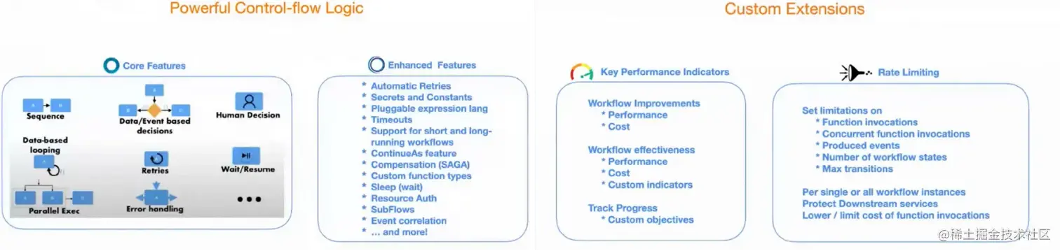 除了上述核心的控制流逻辑,CNCF Serverless Workflow规范也提供了自定义扩展能力。目前社区规范提供两个拓展:关键性能指标和限流。 用户可以通过关键性能指标的扩展能力(如工作流的整体指标、事件的消费与生产指标、函数使用指标、工作流状态指标等)定义工作流,使用自定义指标衡量工作流的性能,对性能和成本进行增强。此外,用户也能够通过限流的拓展能力对调用进行速率的限制,这在无服务器领域尤为重要,比如函数调用并发的限制、调用事件数量的限制、工作流状态总数的限制、工作流执行期间转换的限制等。