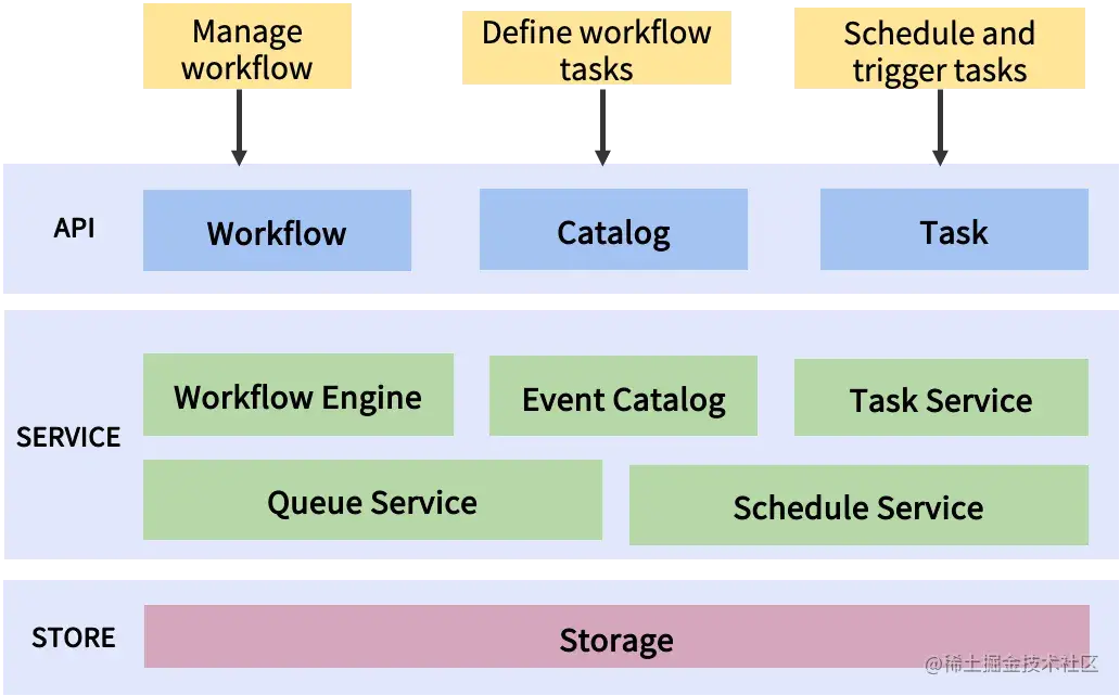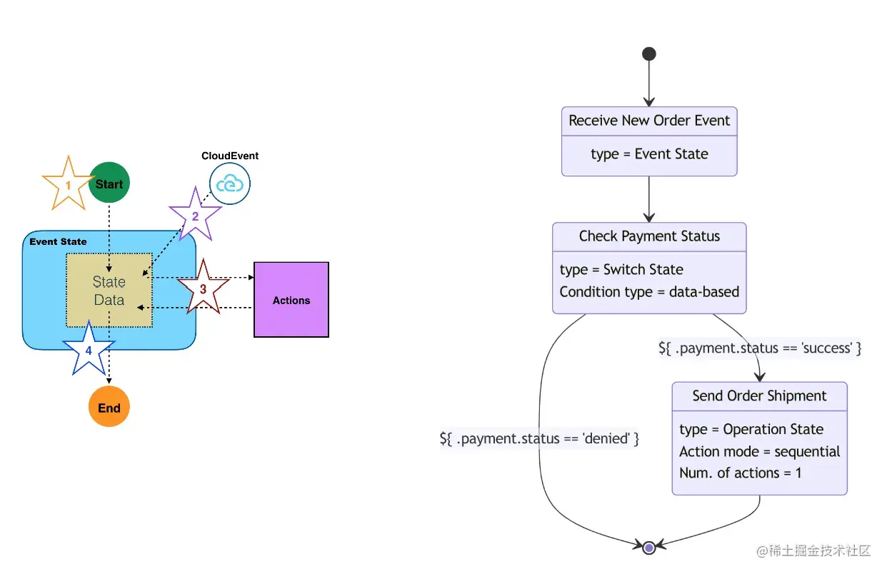 一个工作流状态可以包括Actions应在工作流执行期间调用的服务/功能。这些Actions可以引用Function定义如何调用这些功能/服务的可重用定义。它们还可以引用触发基于事件的服务调用的事件,以及等待表示此类基于事件的服务调用完成的事件。