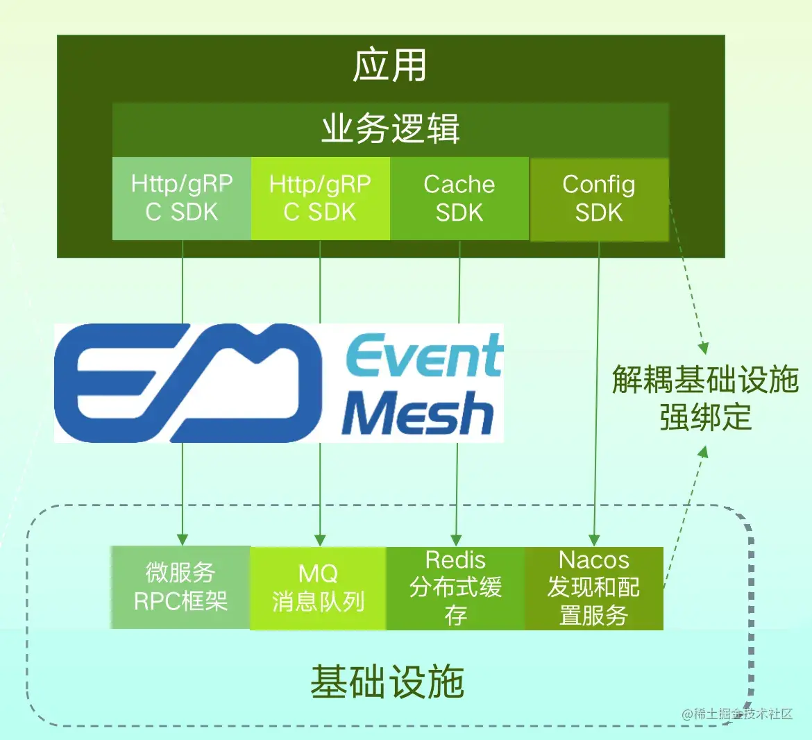 EventMesh 作为事件基础设施,主要负责事件的传输、路由和序列化。它可以提供用于处理事件流的 API。事件基础设施提供对多种序列化格式的支持,并对架构质量(例如容错、弹性可伸缩性、吞吐量等)产生重大影响,也可以存储事件以创建事件存储,事件存储是恢复和弹性的关键架构模式。
