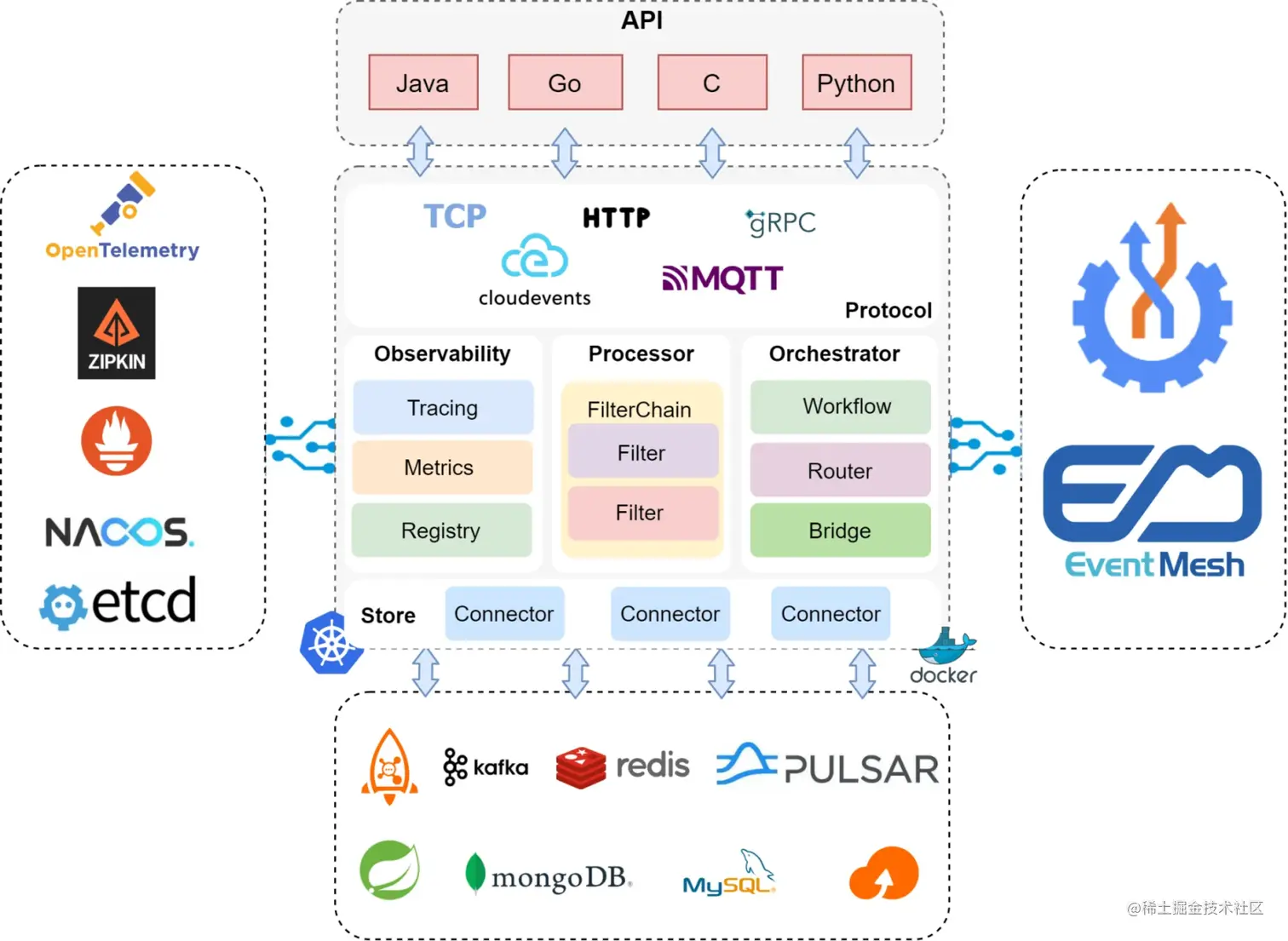 EventMesh Runtime 是一个微内核,插件化的架构,可以对接到后端的中间件或者服务,比如事件的存储 RocketMQ、Kafaka 以 及 Apache Pulsar 等;如果需要有一些状态更新维护的时候,可以对接到后端的 Redis、MySQL 以及 Mongo DB 等;如果需要有一些冷数据更新的时候,也是可以通过插件化的形式连接到 S3,ES 等存储。