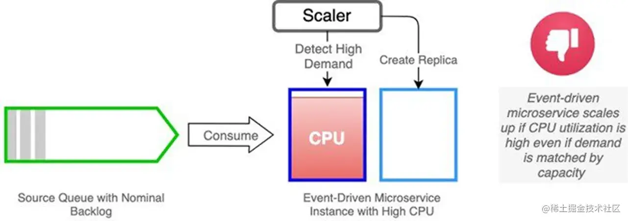 但是这两种场景,如果在事件驱动的服务下,我们采用 Queue 队列堆积的监控方式可以实现以下效果。首先是在资源占用很高,但队列的任务没有堆积的情况下,可以不进行扩容;其次,在占用当前的 CPU 的资源,但没有任务处理的情况下,可以进行缩容。在我看来,伸缩监控的指标应该根据当前处理的任务堆积情况来判断。