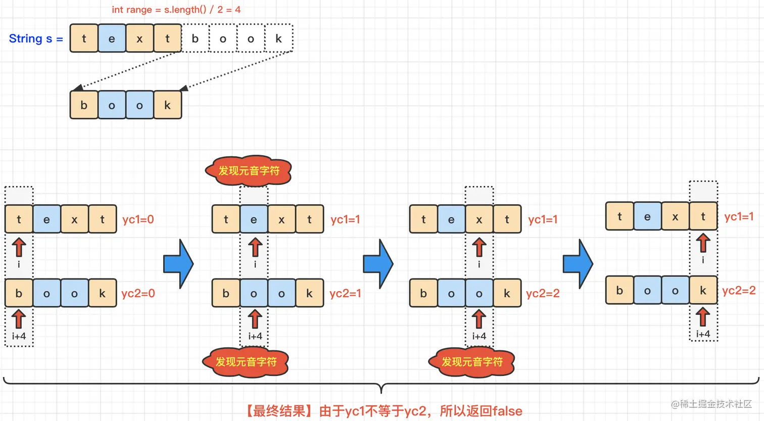 【步骤3】同时遍历a和b,a的遍历下标是i,b 的遍历下标是i+range;如果发现a中存在元音字符,则yc1加1;如果发现b中存在元音字符,则yc2加1;