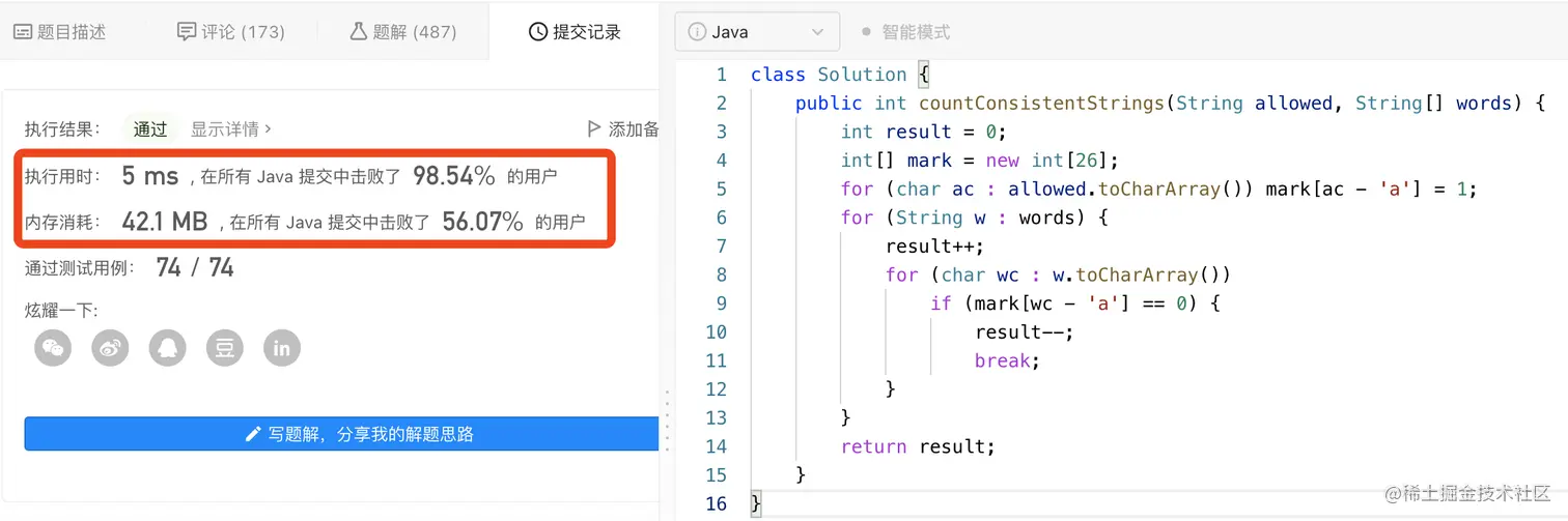 那么怎么判断字符是否在allowed中呢?我们可以选择Map结构或数组结构来实现。以数组为例,由于英文字母有26个,所以创建一个长度为26的int数组,即:int[] mark = new int[26]; 那么,字符‘a’存储到下标为0的位置,字符‘b’存储到下标为1的位置……。默认mark[i]等于0,遍历allowed字符串中的每个字符,然后将相应字符位置的值赋值为1。这样,就可以在遍历w字符时,快速判断出是否存在于allowed中。
