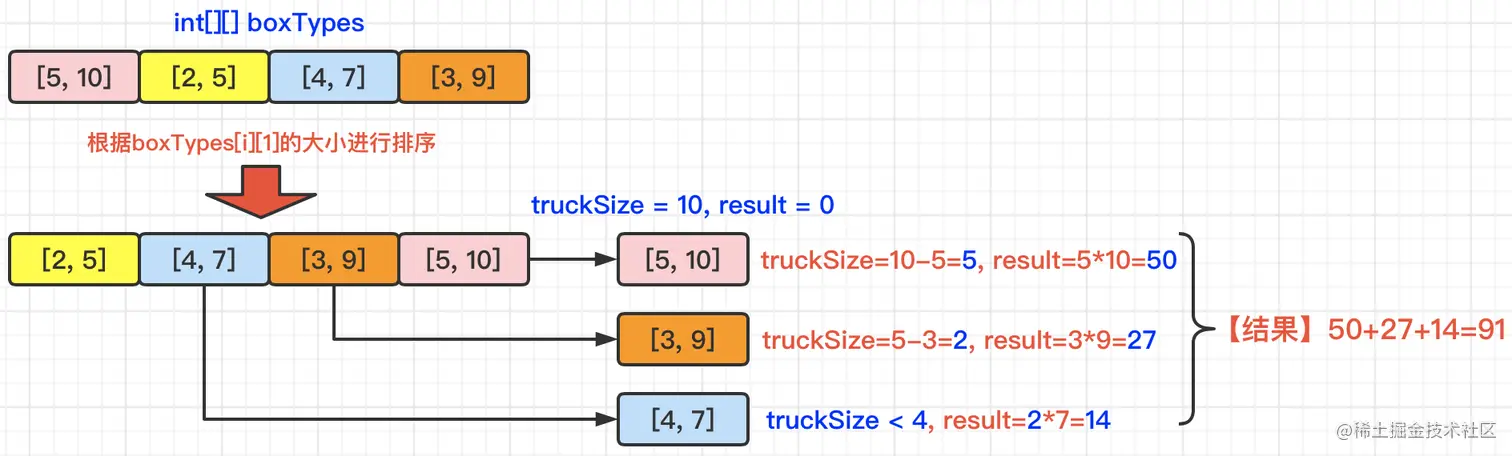 【输入】boxTypes = [[5,10],[2,5],[4,7],[3,9]], truckSize = 10