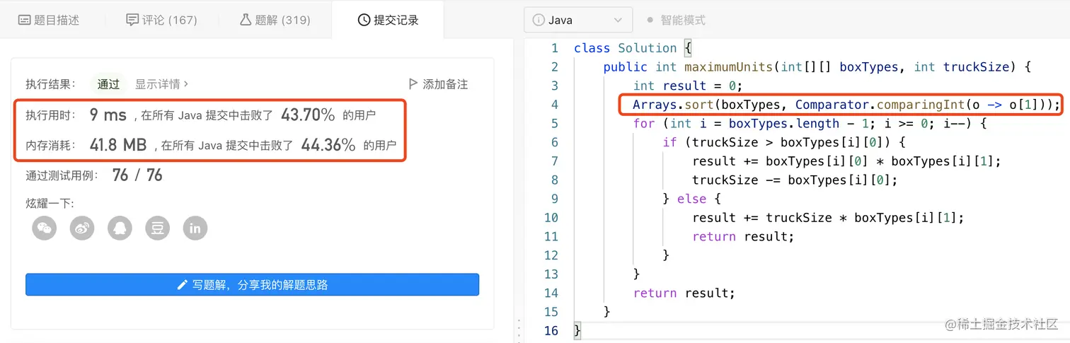 其中,关于排序,我们可以采用Arrays.sort(...)方法对数组boxTypes进行排序;并且由于提示中描述了numberOfUnitsPerBox <= 1000,所以我们也可以通过创建int[1001]的数组来实现排序。具体操作如下图所示: