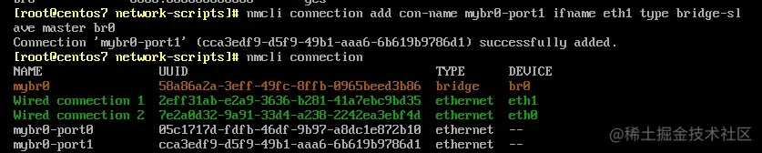 [root@centos7 ~]# nmcli connection add con-name mybr0-port1 ifname eth1 type bridge-slave master br0