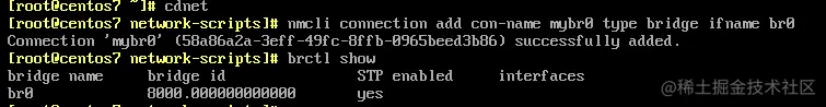[root@centos7 ~]# nmcli connection add con-name mybro type bridge ifname br0