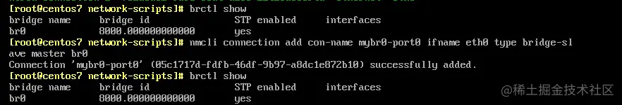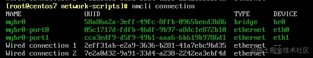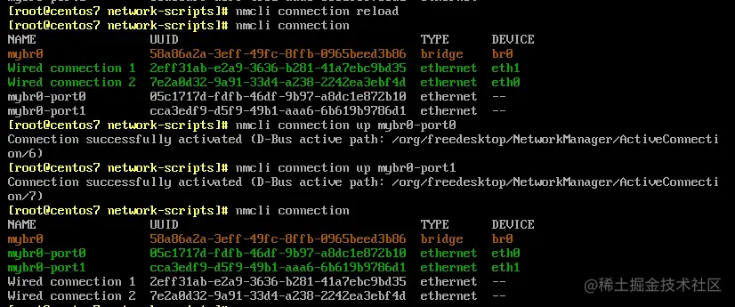 [root@centos7 ~]# nmcli connection up mybro-port1