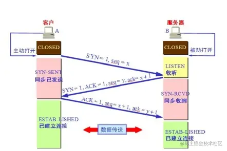 1)发送端首先发送一个带有SYN(synchronize)标志地数据包给接收方。