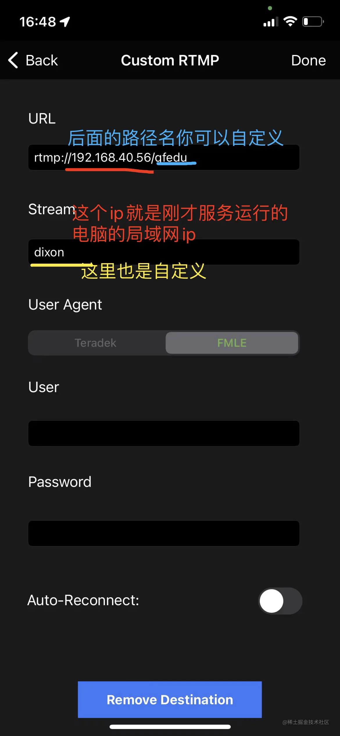 在配置当前填写推流的地址 这个地址 由服务器ip地址和 一个自定义的访问路径