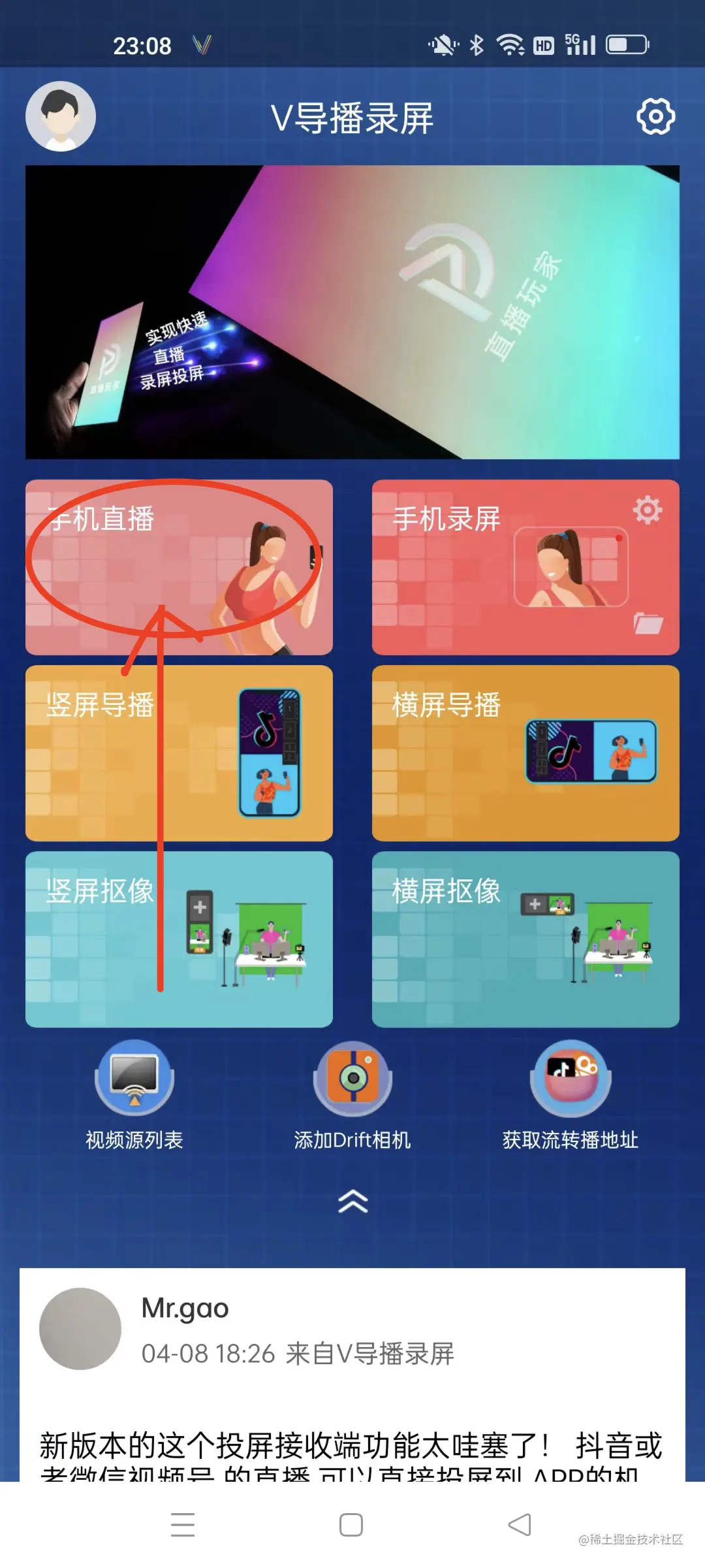 打开v导播录屏的主界面 点击手机直播