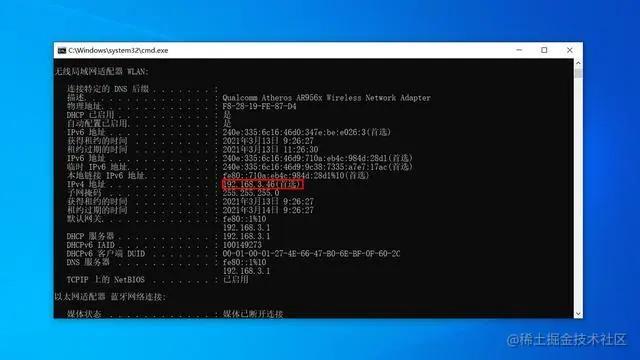 为了后面方便我们成app把视频推流到服务端来需要通过系统自带的“CMD”查看局域网内所使用的IP地址