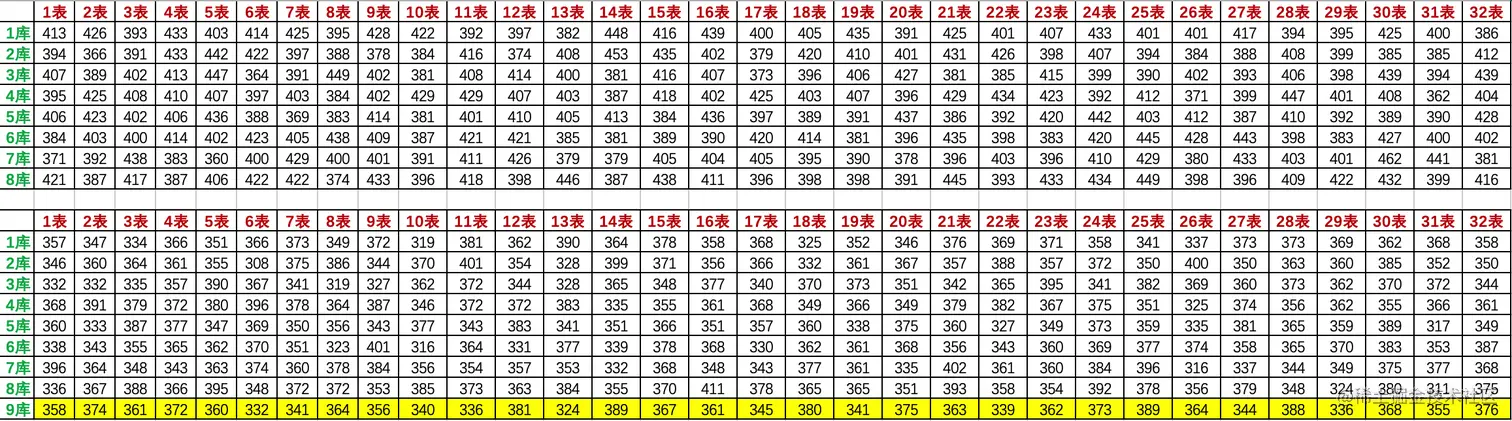 通常情况下做分库分表会考虑到以后的扩容操作,那如果说按照2的次幂扩容第一次是8库32表,之后是16库32表,在之后32库32表。那么这样扩容下去,其实是扛不住的。所以大多数时候希望是从8库扩到9库,而不是一下翻倍。那我们来测试下9库32表,斐波那契散列的分散效果。