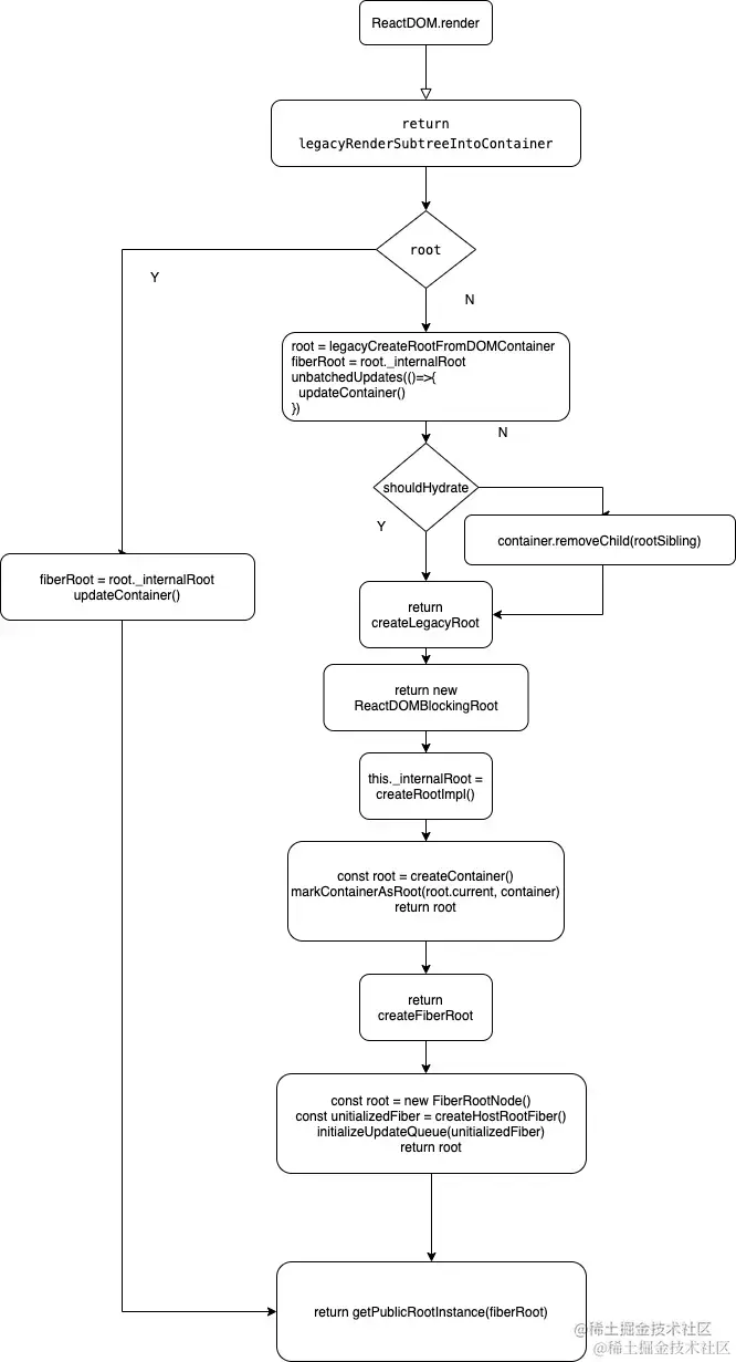 初次渲染进入创建root的环节:root = container._reactRootContainer = legacyCreateRootFromDOMContainer(container, forceHydrate)