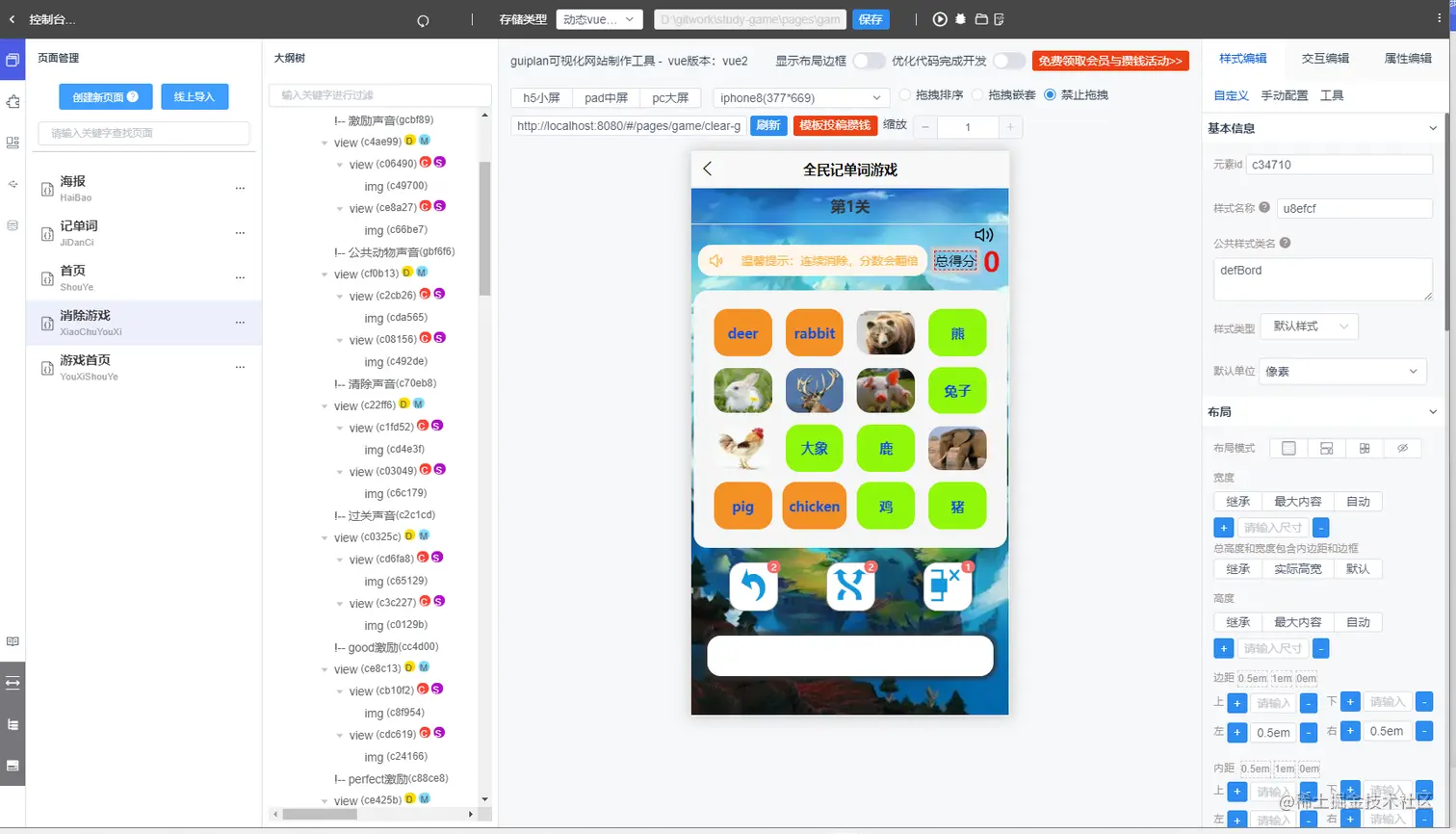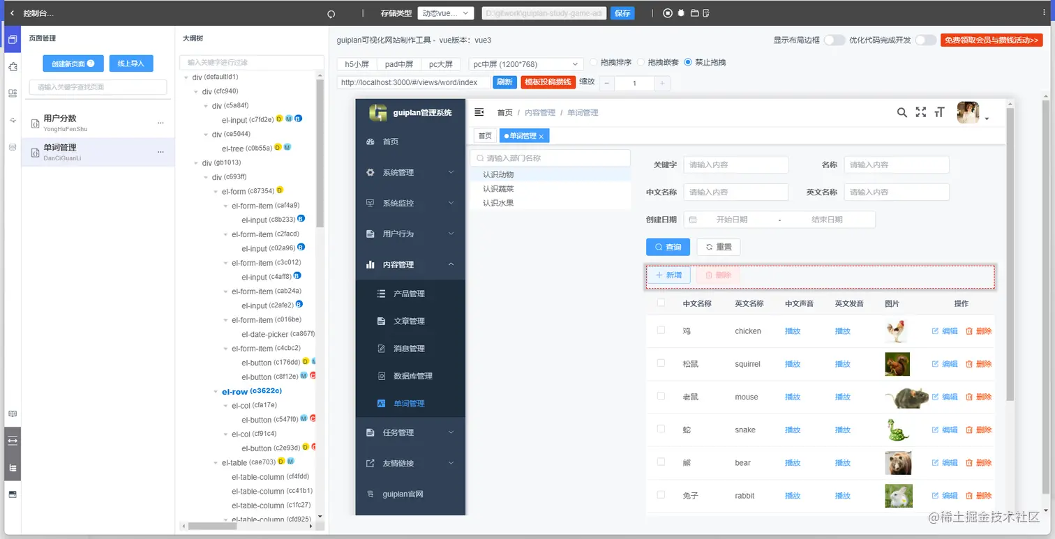 最后我们来看看我这边用guiplan低代码开发工具做好的全名记单词游戏项目。小程序端与后台以及后端接口配置都是可视化开发。