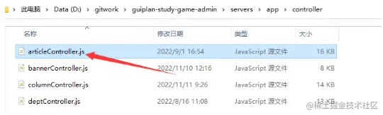 当然这还远远没有结束,因为我们发现打包之后静态文件无法访问,移动文件夹位置之后反复测试,结果发现数据库备份的位置也有所偏差。总之对文件的读写这块存在诸多问题。反复阅读代码发现我们在开发过程中用到了一个__dirname这么一个变量,而这个变量就是根据当前的文件来获取绝对位置。比如文章控制器这块用到了这个变量,则它的绝对路径为D:\gitwork\guiplan-study-game-admin\servers\app\controller\articleController.js