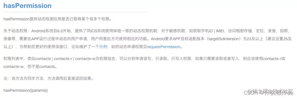 hasPermission : 用来判断应用是否已获取了某个(或某几个)应用权限的用户授权