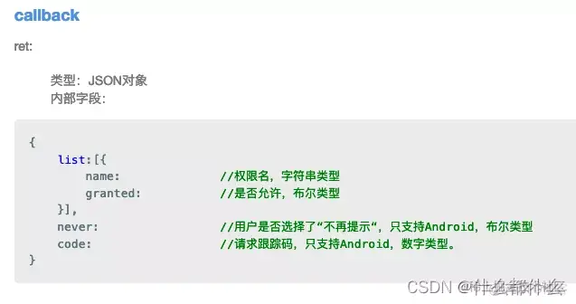 handlePermissionResult(resData, sucCB) { const [list = [], never] = resData; // 遍历申请结果数组 const badPermissions = []; list.forEach(permission => { if(!permission.granted) { // 动态权限未获得授权 badPermissions.push(permission); } }); if(badPermissions.length === 0) { // 说明申请权限都已获得授权,则返回执行正常的后续业务逻辑 if(typeof sucCB === 'function') sucCB(); } else { // 这里需要结合具体的业务逻辑,编写对于未授权权限的处理逻辑。 api.closeWidget({ silent: true }); // 示例代码,不授权将退出应用 }}