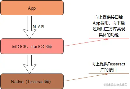 调用过程主要涉及到三方面,首先应用层实现样例的效果,包括页面的布局和业务逻辑代码;中间层主要起桥梁的作用,提供N-API接口给应用调用,再通过三方库的接口去调用具体的实现;Native层使用了三方库Tesseract提供具体的实现功能。
