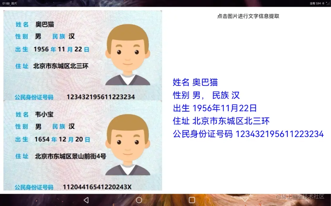 身份信息识别的布局最外层是一个水平布局,分为左右两部分,左边的子布局是垂直布局,里面是两张不同的身份证图片,右边子布局也是垂直布局,主要是标题区和识别结果的内容显示区。